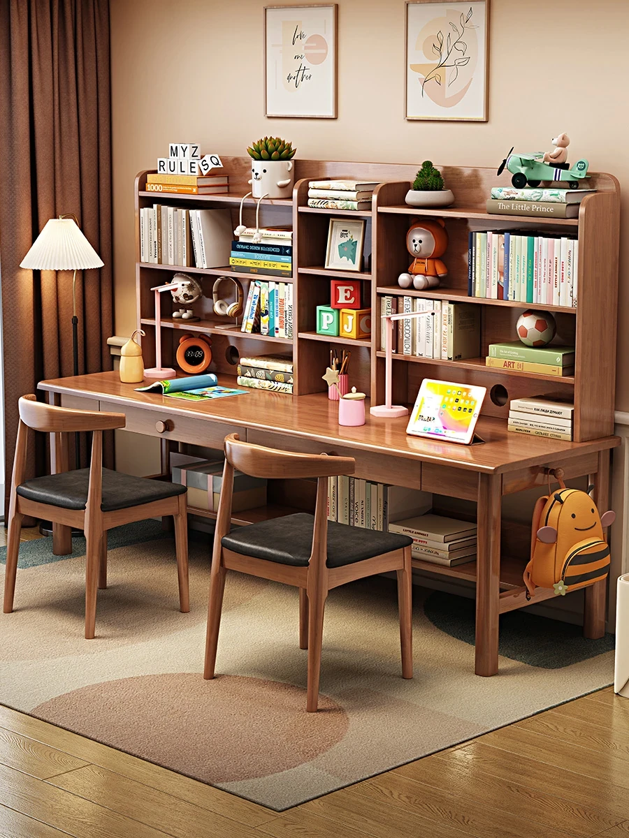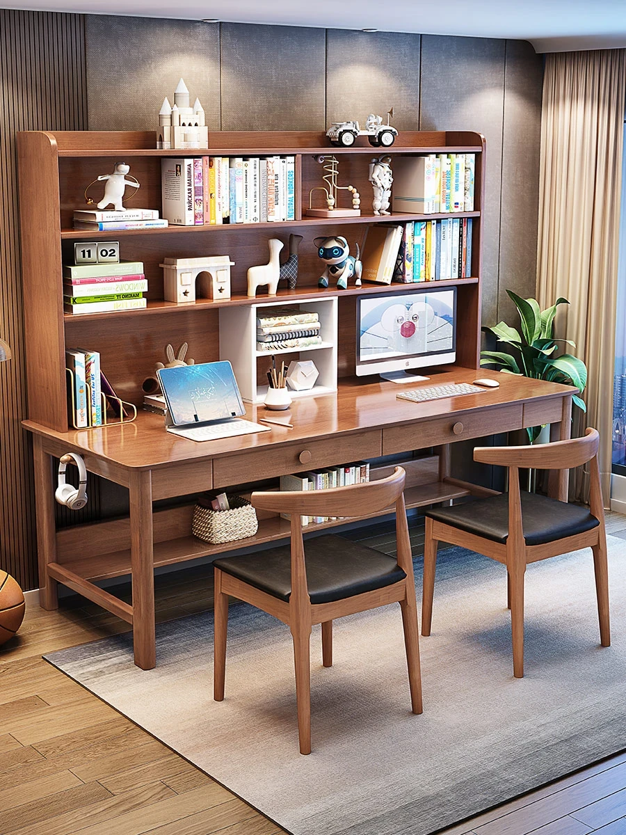 【魅力家具】高級天然木材2人用学習デスク&本棚付き!省スペースで実現するスタイリッシュな長机、快適な勉強&仕事環境へ!