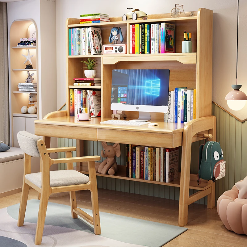 【厳選天然木材使用】子供用実木デスクセット: 書棚・書柜一体型!中小学生の勉強机にも最適な書斎・寝室用コンピューターデスク