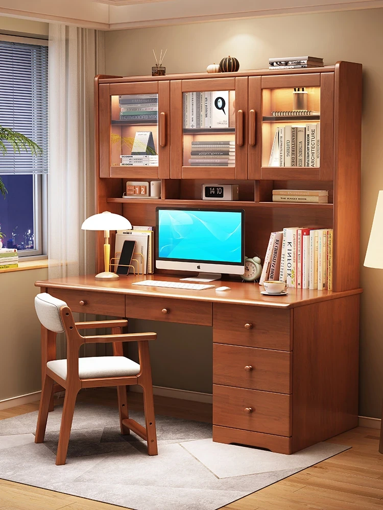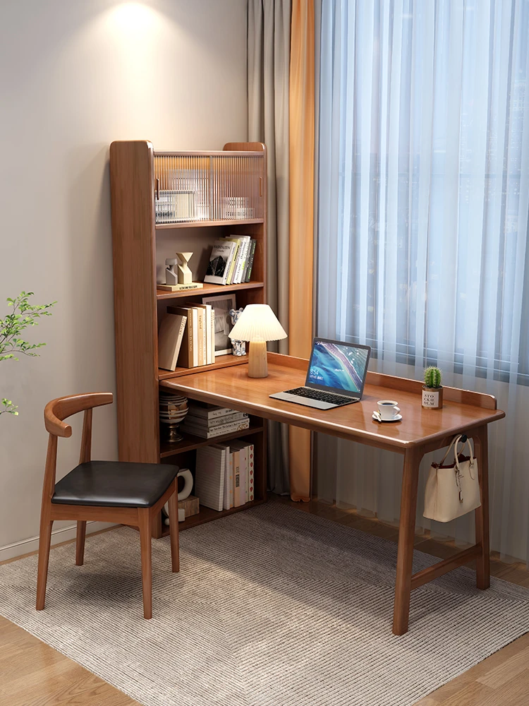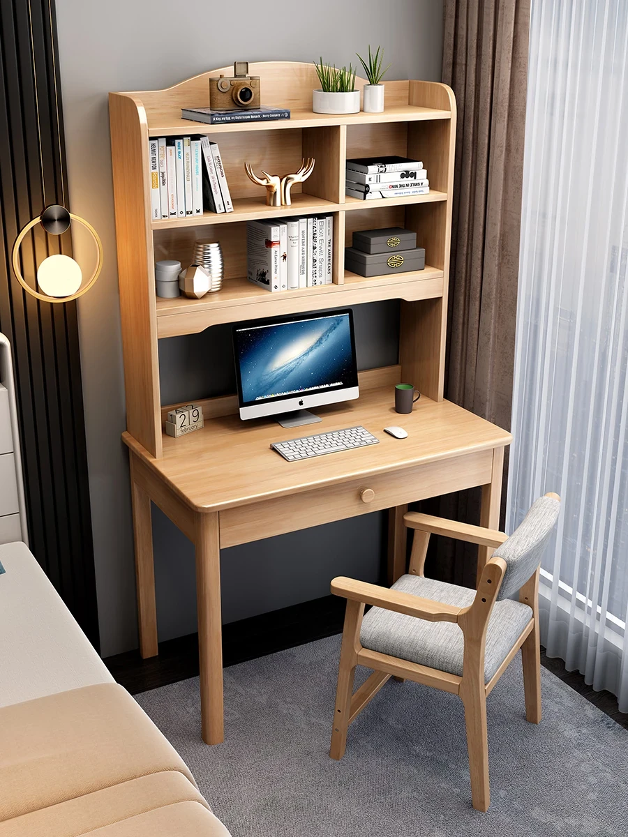シンプルモダンなデザインの天然木製デスク - 家庭用書斎やベッドルームに最適!学生も使える本棚付きオールインワンデスク