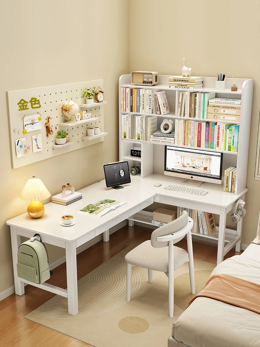 クリーム風木製コーナーデスク&シェルフ一体型 学生用ホーム家具セット - 7字型L型パソコンデスク 学びを楽しむスタイリッシュなデザイン!