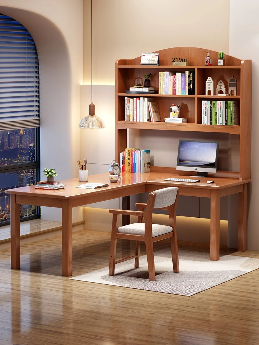 Corner Solid Wood Desk and Bookshelf Combo - Space-Saving L-Shaped Computer Desk for Home, Ideal for Students and Bedrooms, Perfect for Corner Use with Window View