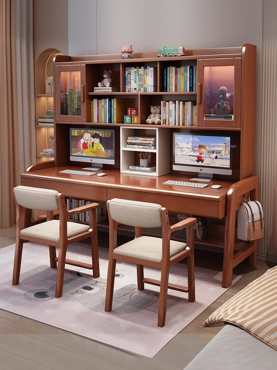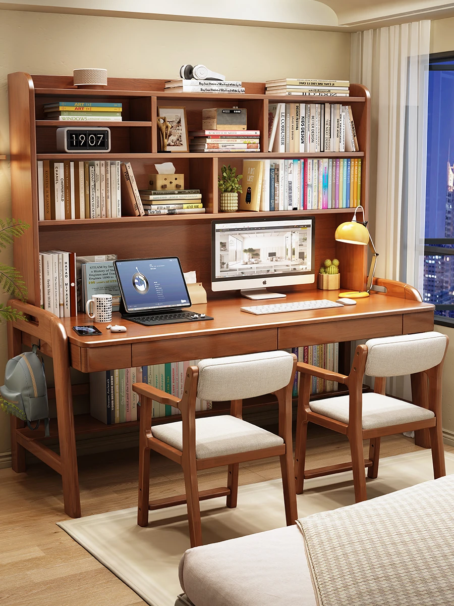 Solid Wood Double Desk with Bookshelf and Storage - Versatile Home Office Solution for Bedrooms and Children's Study Areas, Ideal for Students and Computer Work.