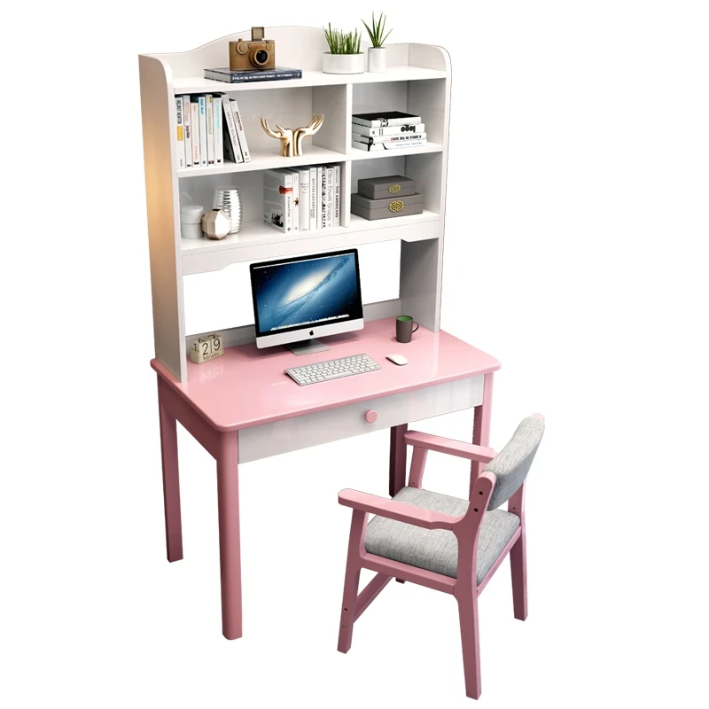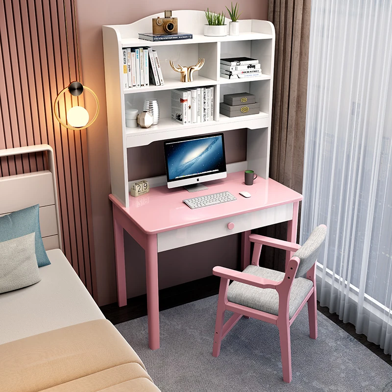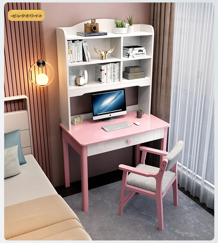 5022#ピンクとホワイトのデスク+アームチェア デスクと本棚一体型デザイン