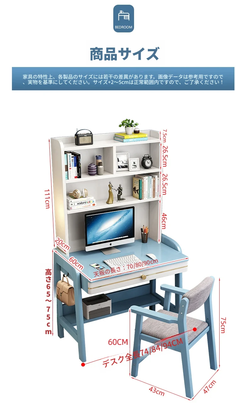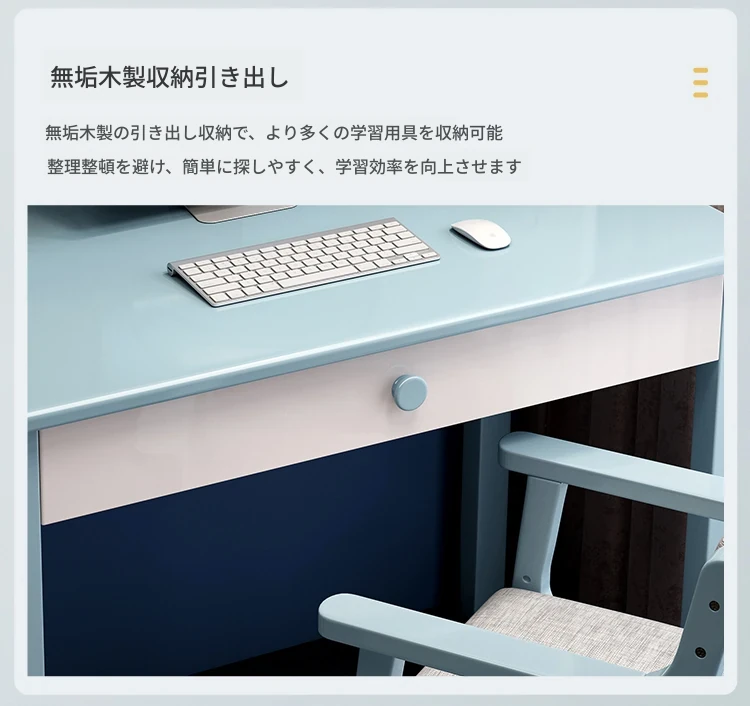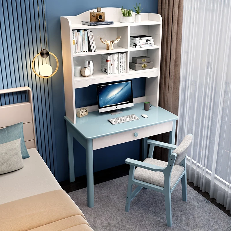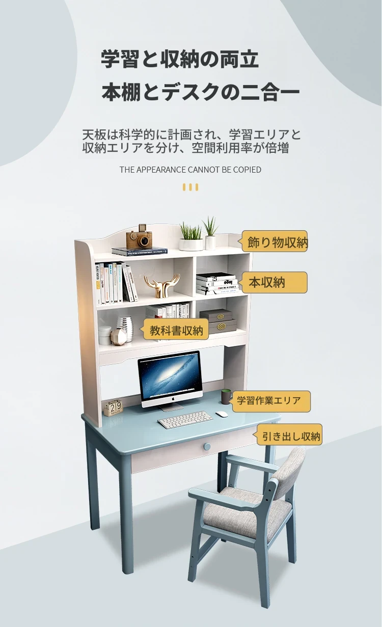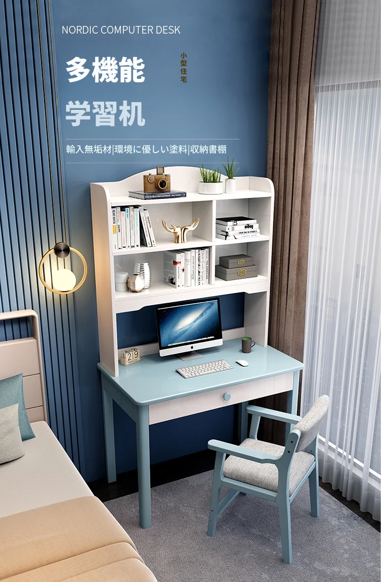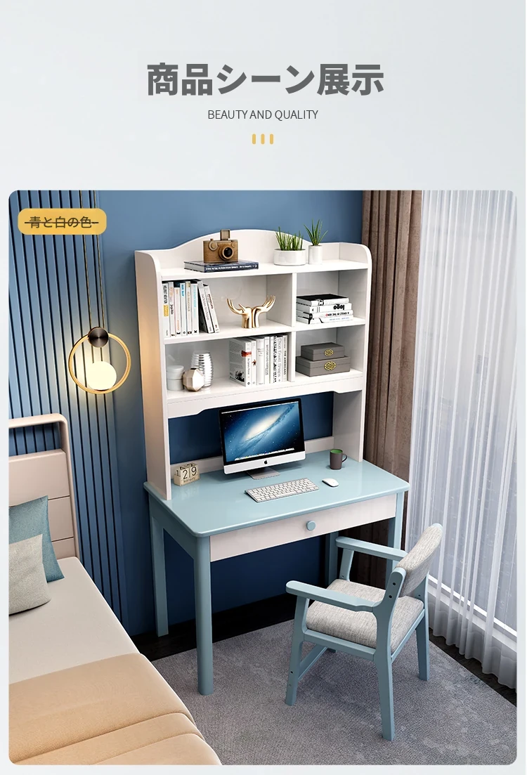 5022# ブルーとホワイトのデスク + アームチェア 一体型デスクシェルフデザイン