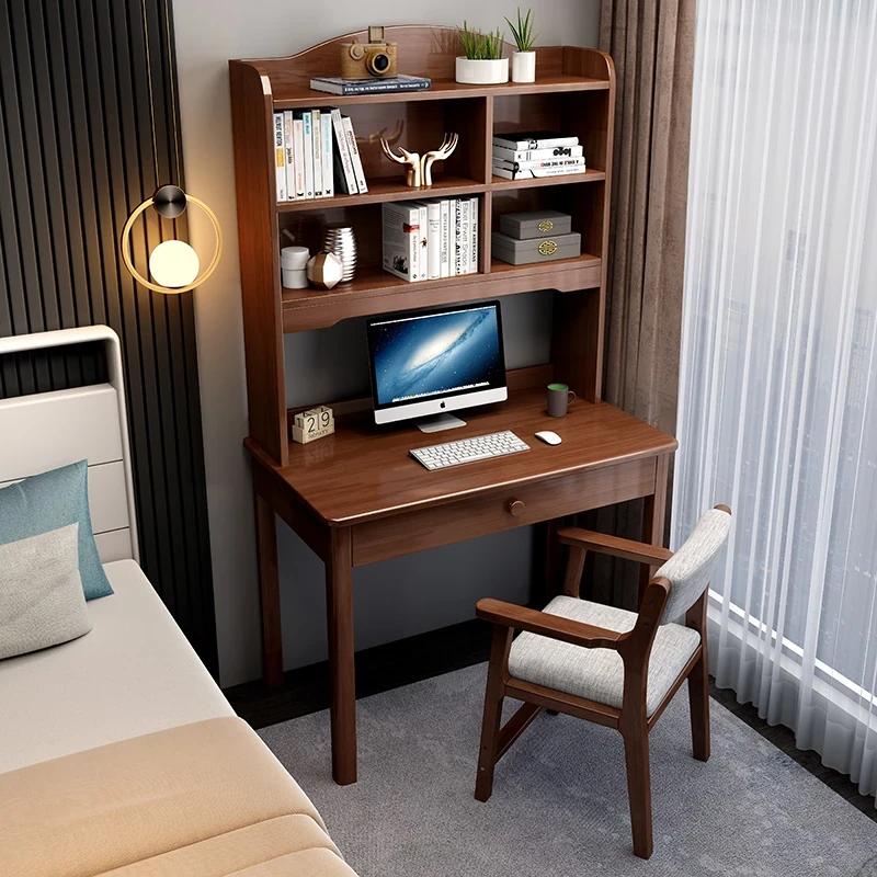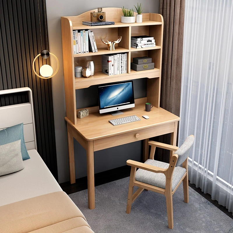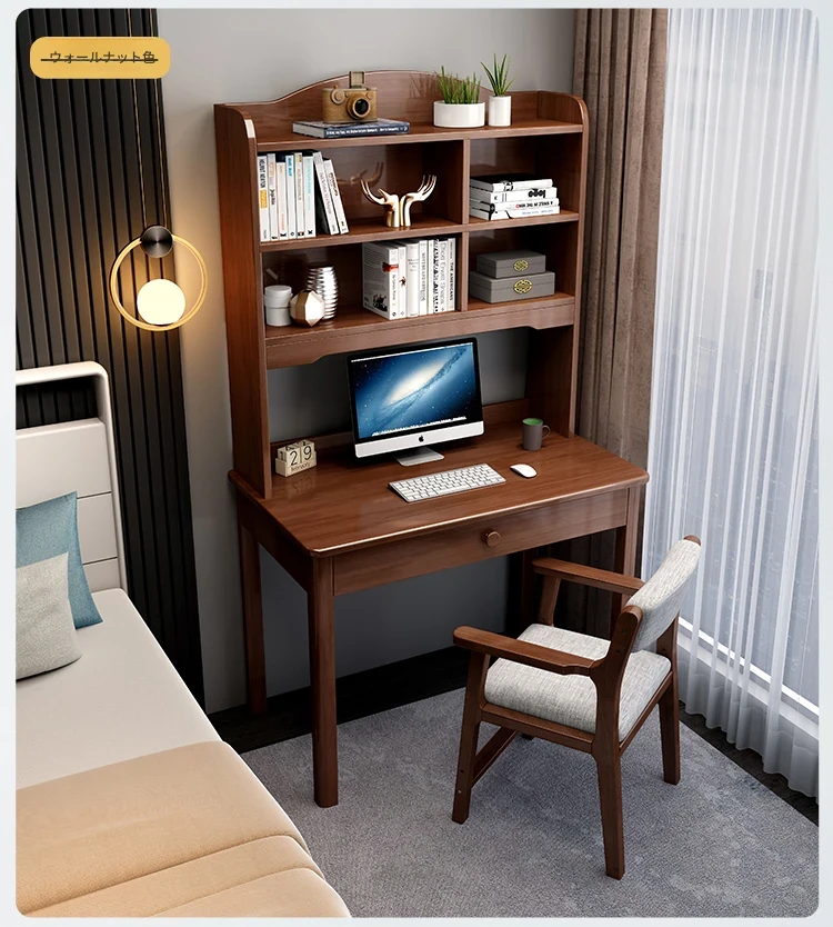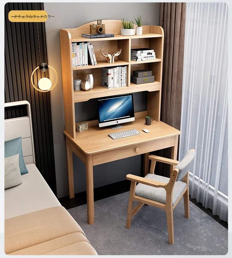 ナチュラルウッドの学習デスク&ブックシェルフ一体型 - コンパクトな子供用&大人用多機能デスク、限られたスペースでもスマートに配置!