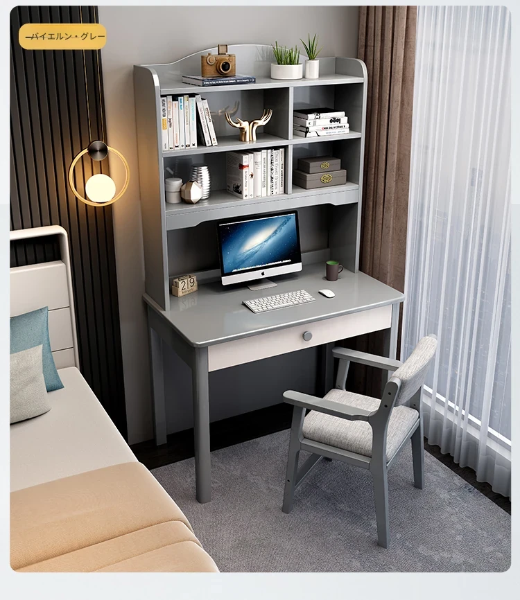 5022#デスク 高級グレー+アームチェア デスクと本棚の一体デザイン