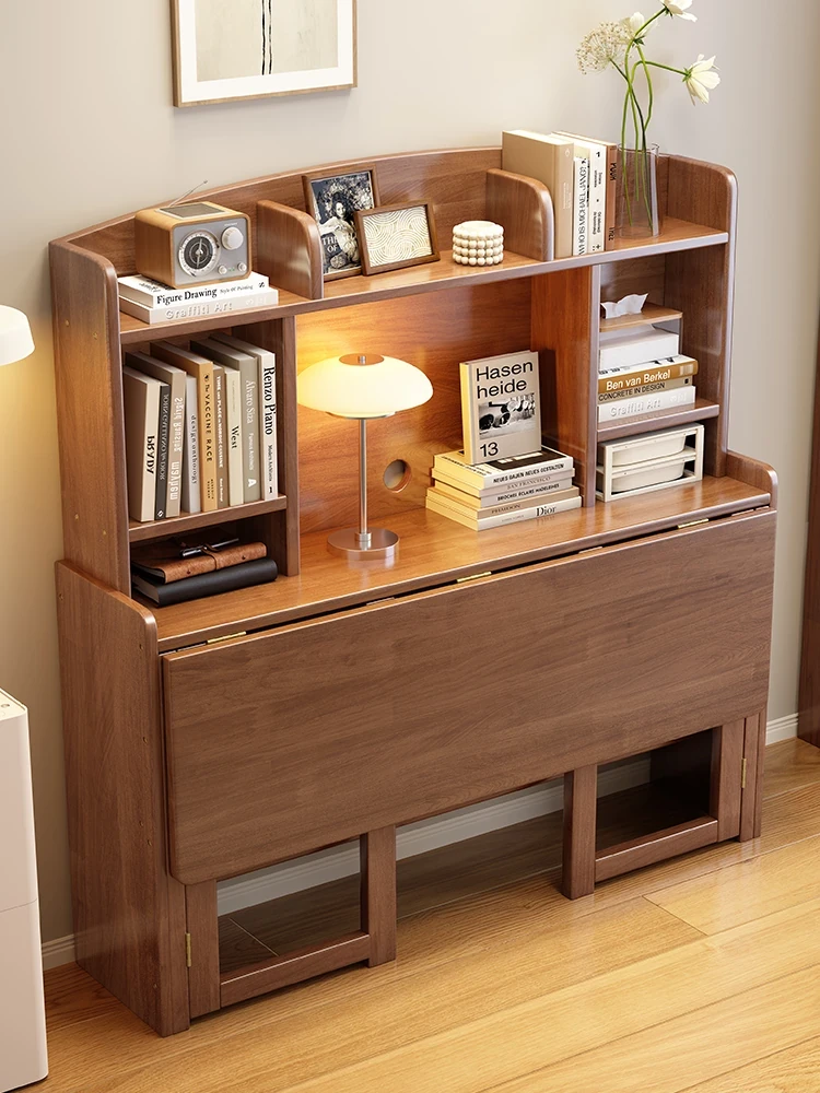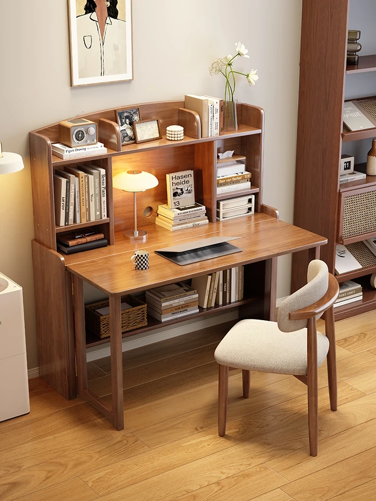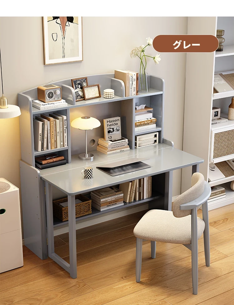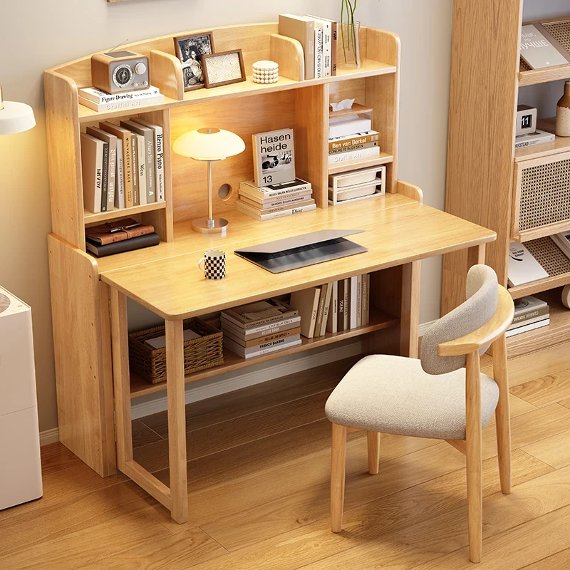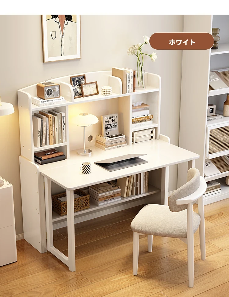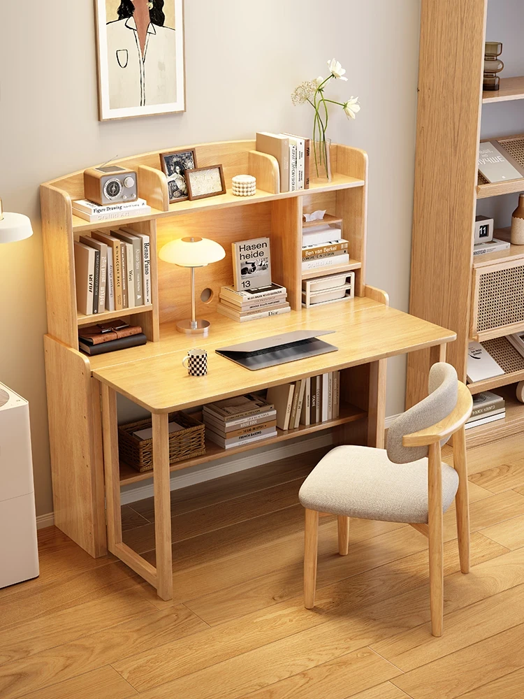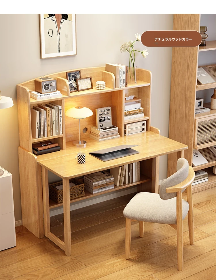 北欧風無垢材コンパクト多機能デスク:折りたたみ式書棚付き、省スペース小型伸縮式デザインで、リビングやベッドルームにも最適なスタディ&オフィス用PCデスク!