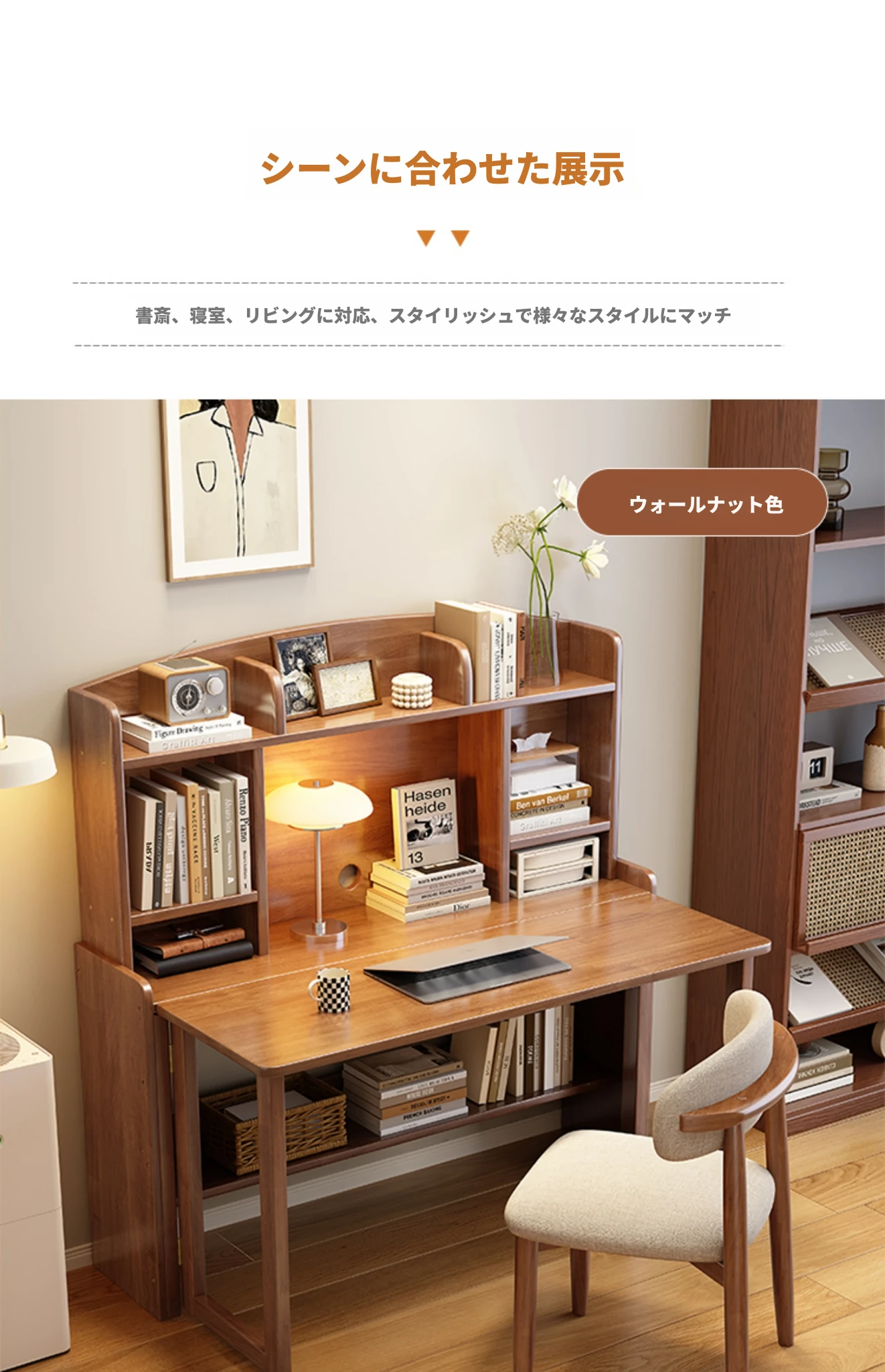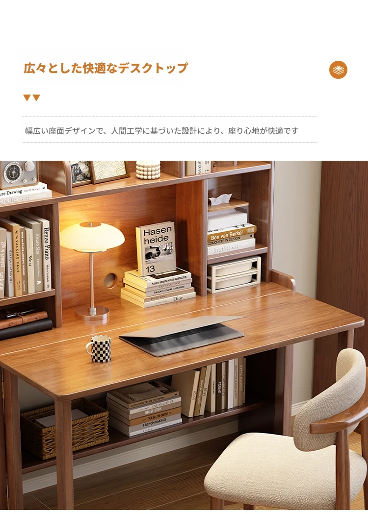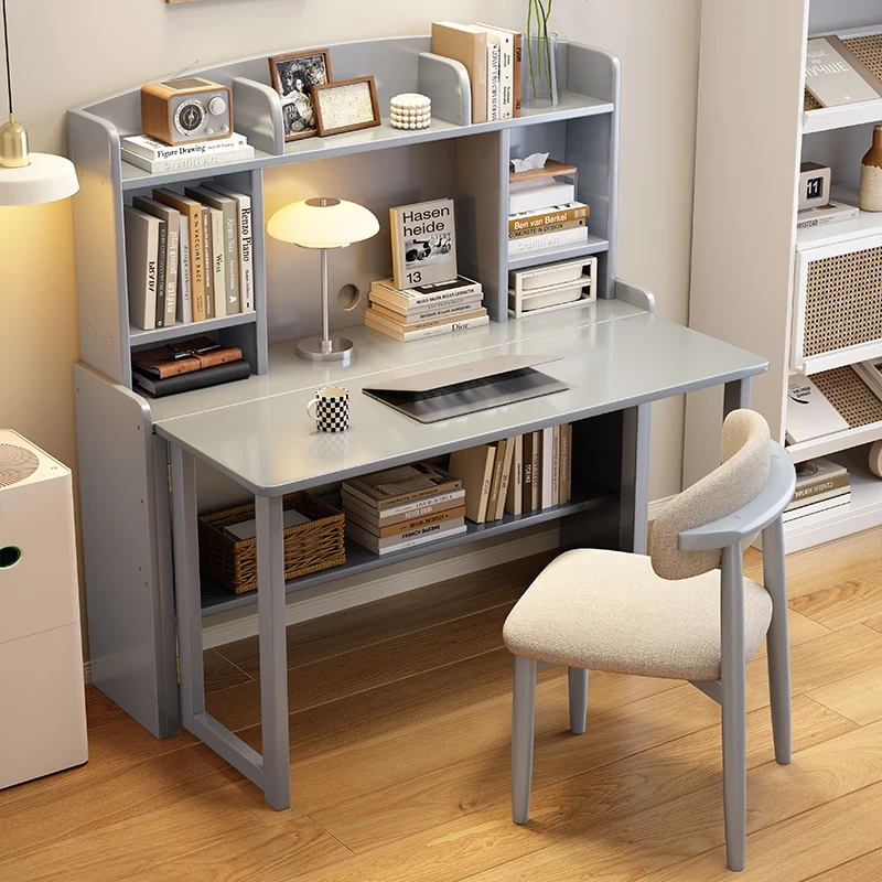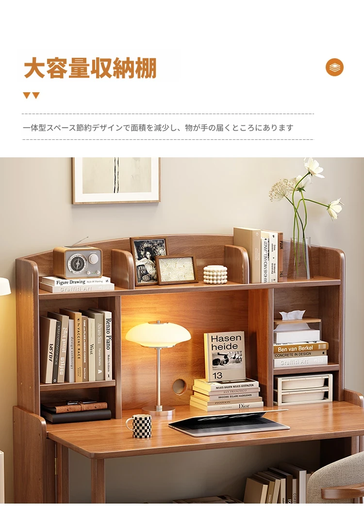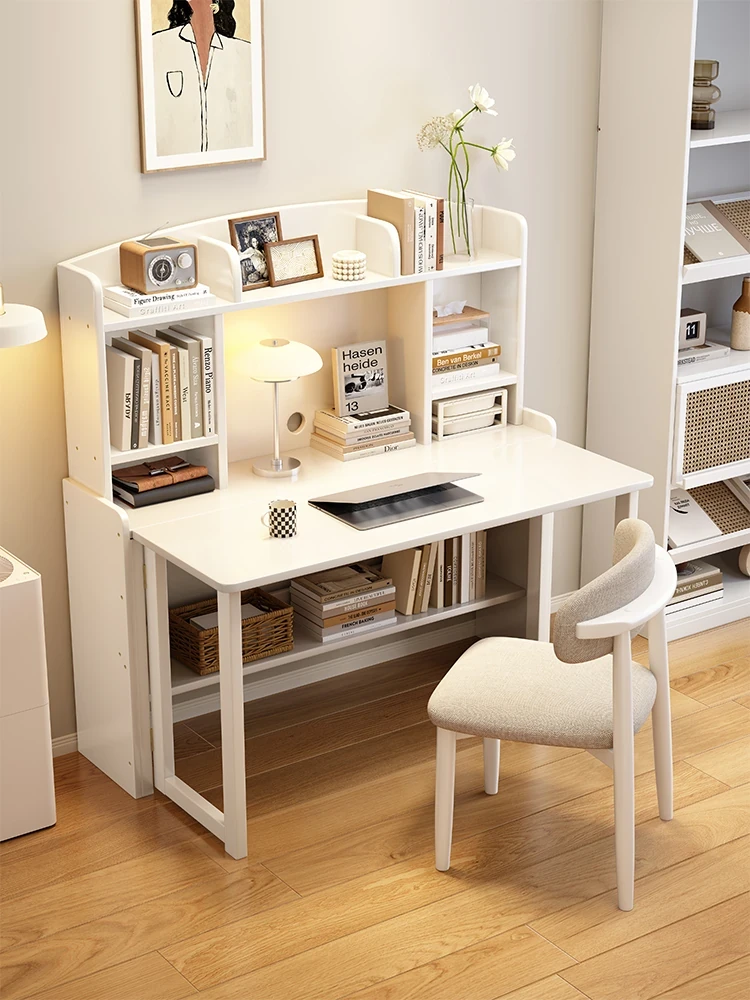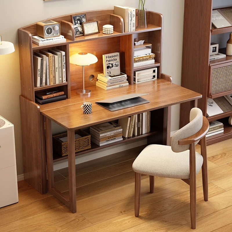 北欧風無垢材コンパクト多機能デスク:折りたたみ式書棚付き、省スペース小型伸縮式デザインで、リビングやベッドルームにも最適なスタディ&オフィス用PCデスク!