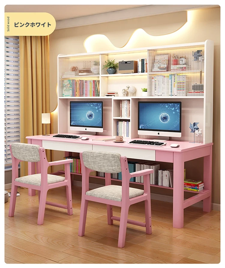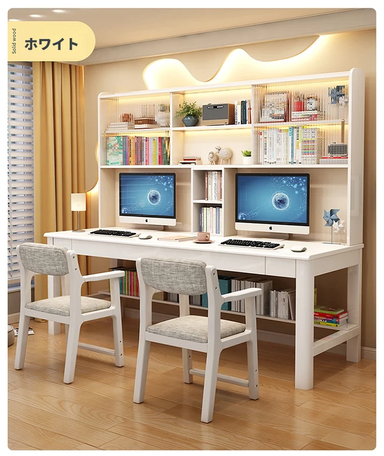 【魅力的学習空間】天然木製ダブルデスクセット:学生向けの多機能デスク&本棚&書庫一体型!子供部屋にぴったりの学習机椅子コンビネーション。