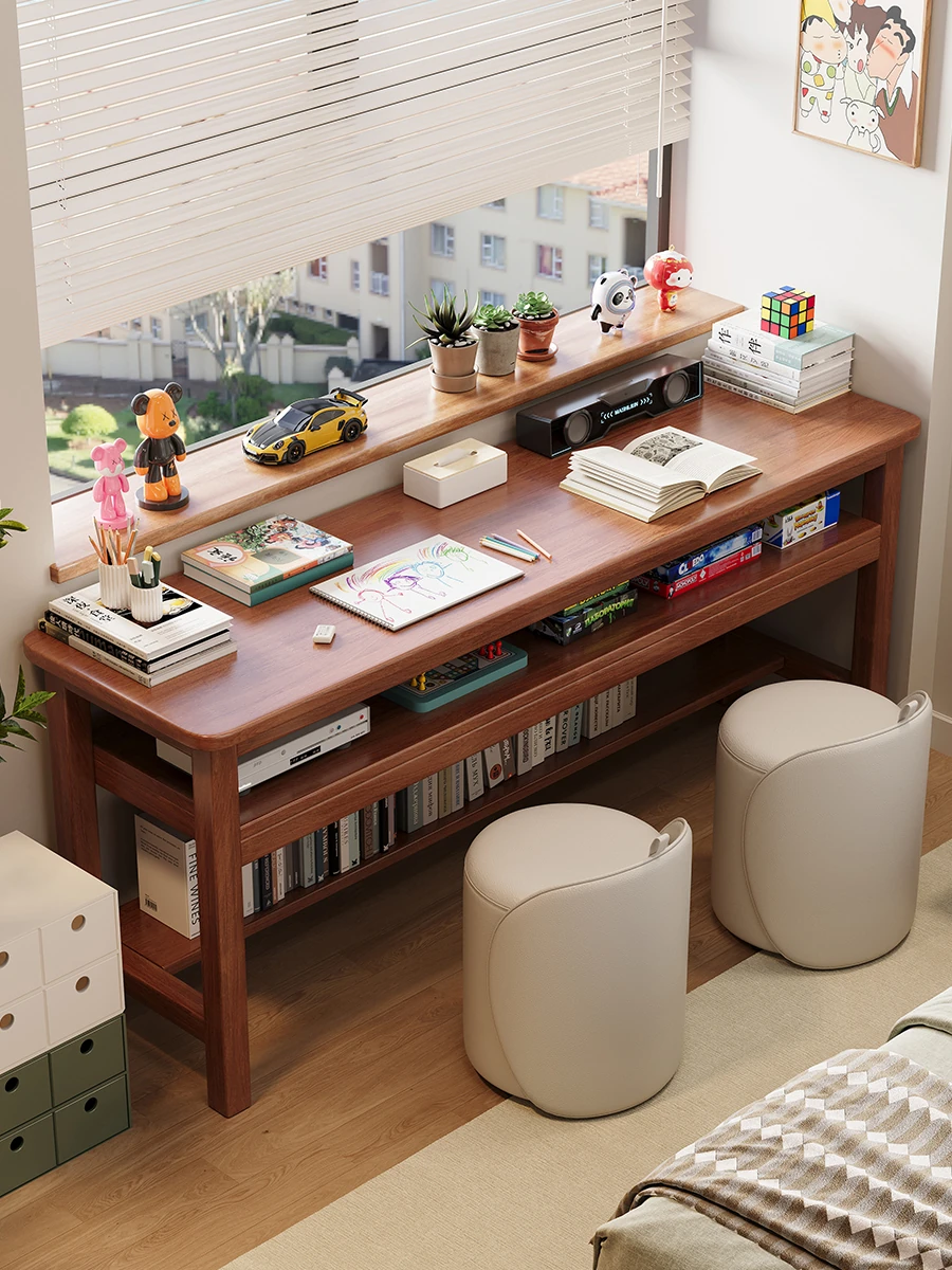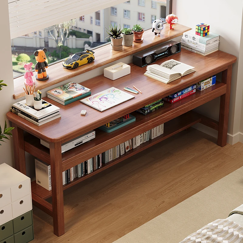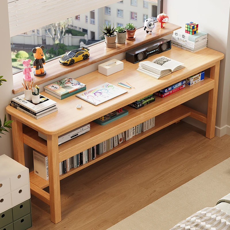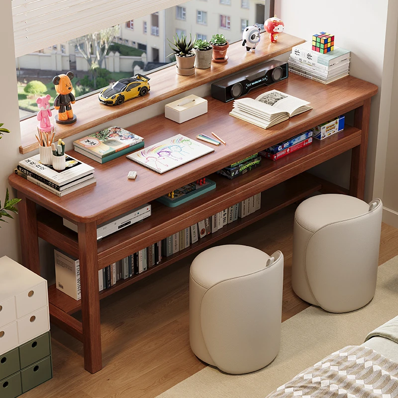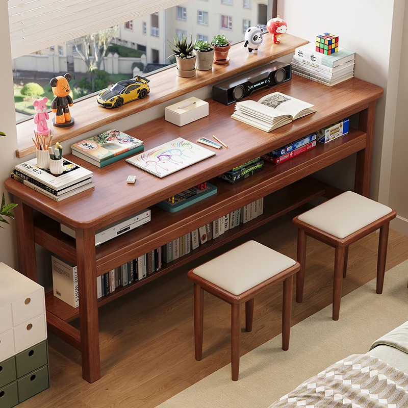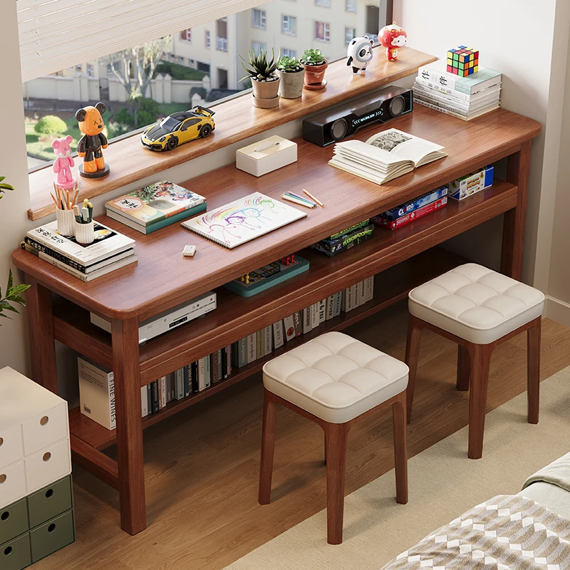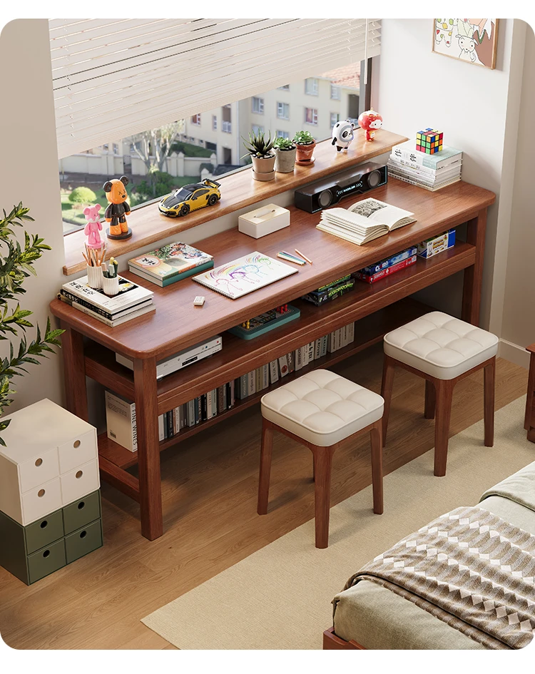 【天然木材の魅力】全実木製デスク 二段式パソコンデスク 学生向け 家庭用 寝室用スリムデスク 壁際設置 小スペースに最適なライティングテーブル