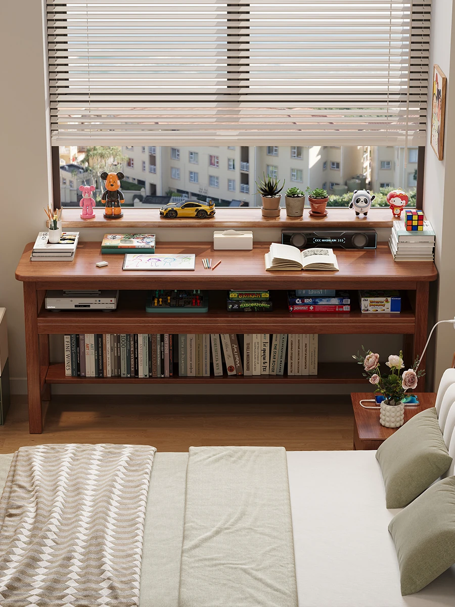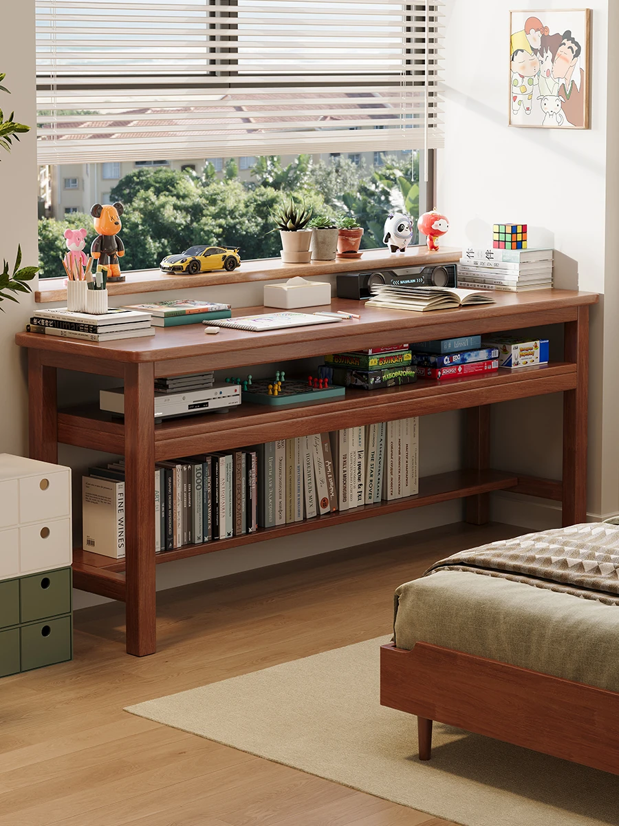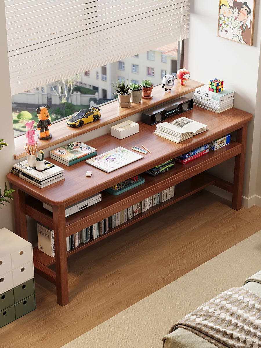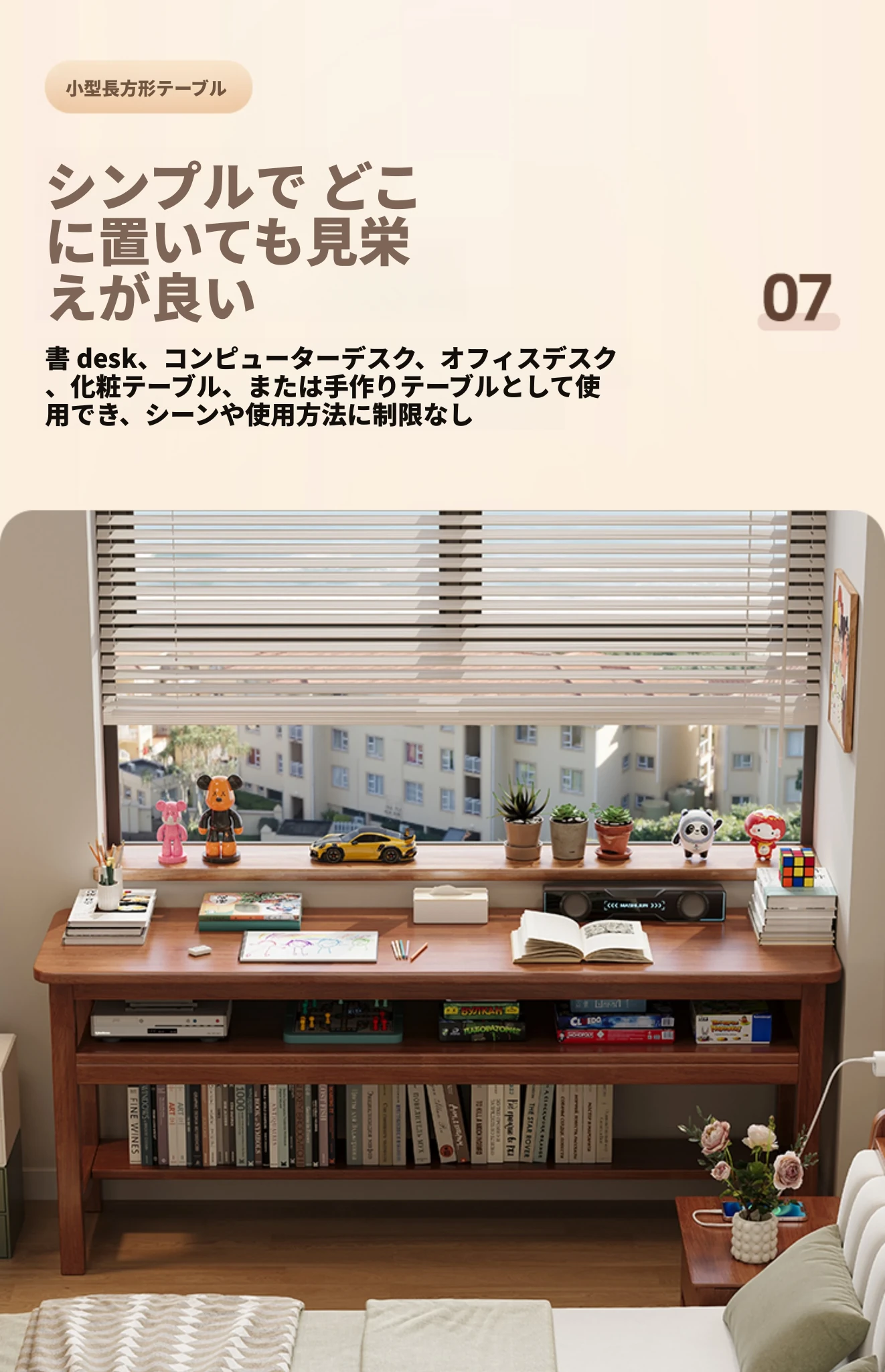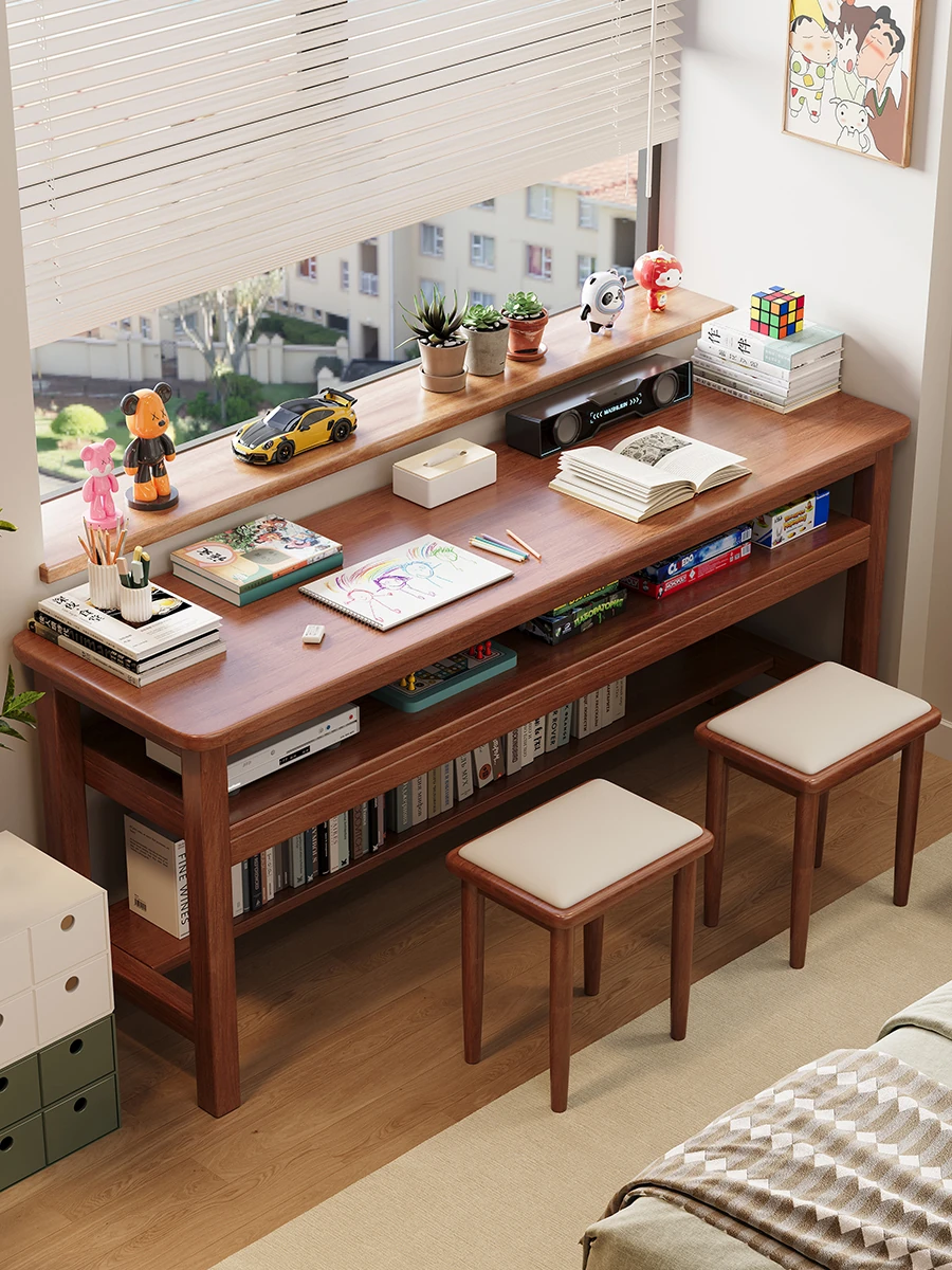 【天然木材の魅力】全実木製デスク 二段式パソコンデスク 学生向け 家庭用 寝室用スリムデスク 壁際設置 小スペースに最適なライティングテーブル