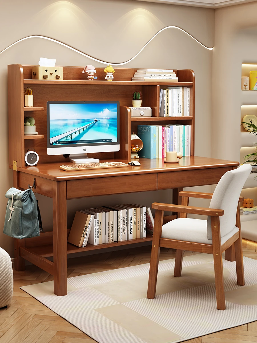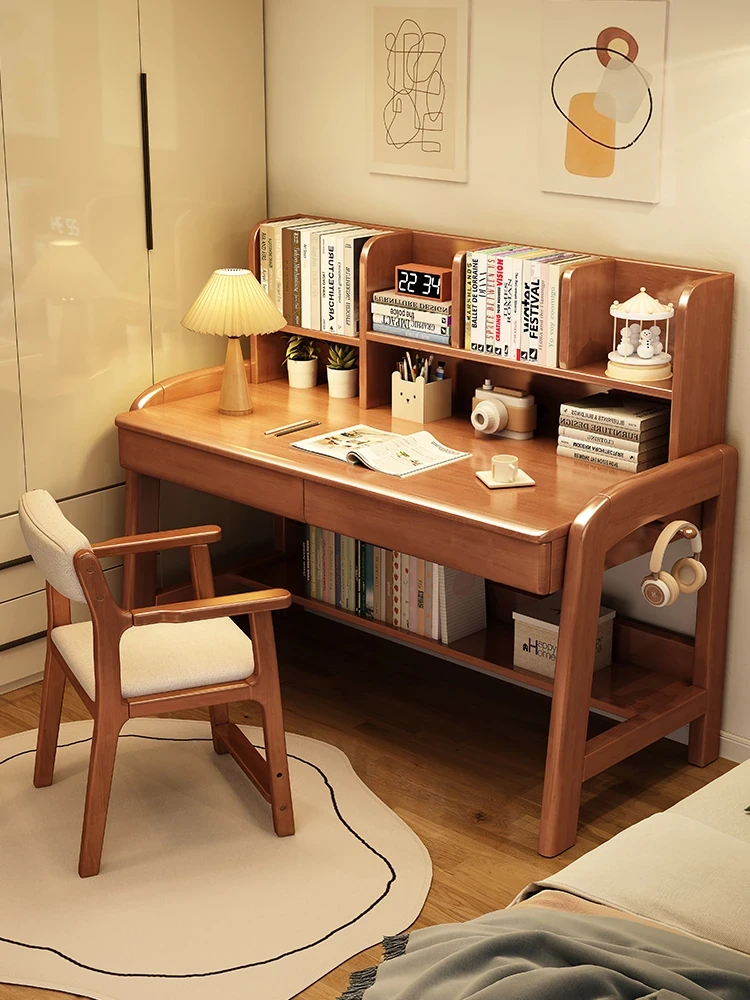 天然木材質の多機能デスクセット:家庭用机と本棚の統合、シンプルな書斎用オフィスデスク、可調節高さの子供用学習机