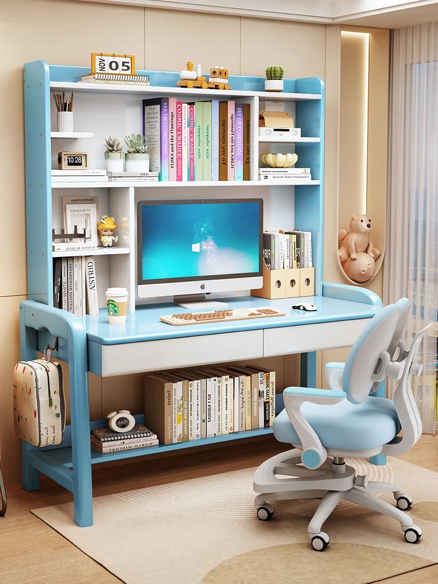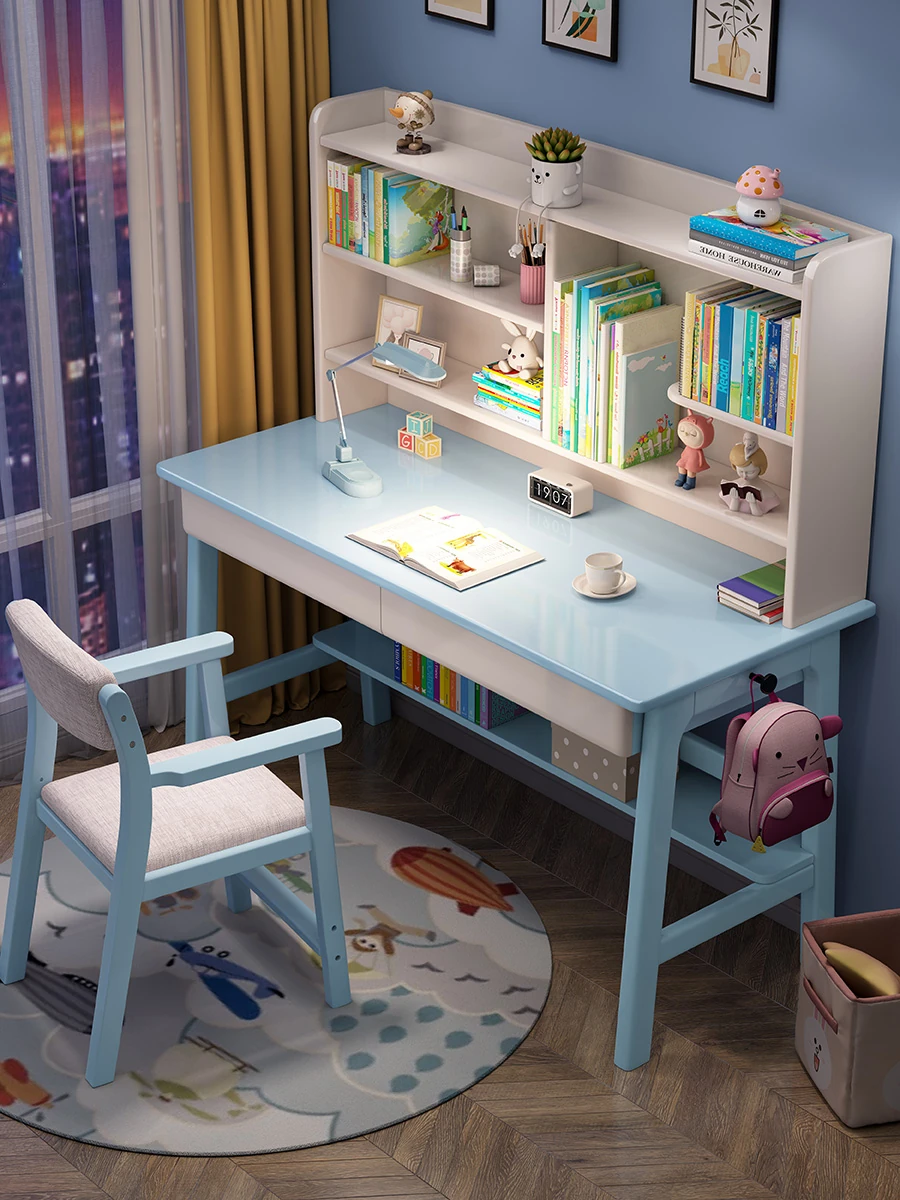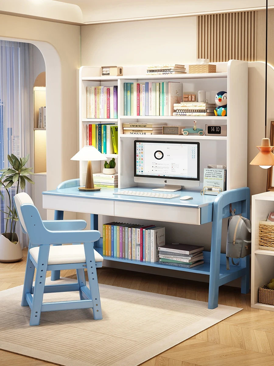天然木製!省スペース設計・高さ調整可能な学習デスク&本棚一体型 子供用ライティングデスク