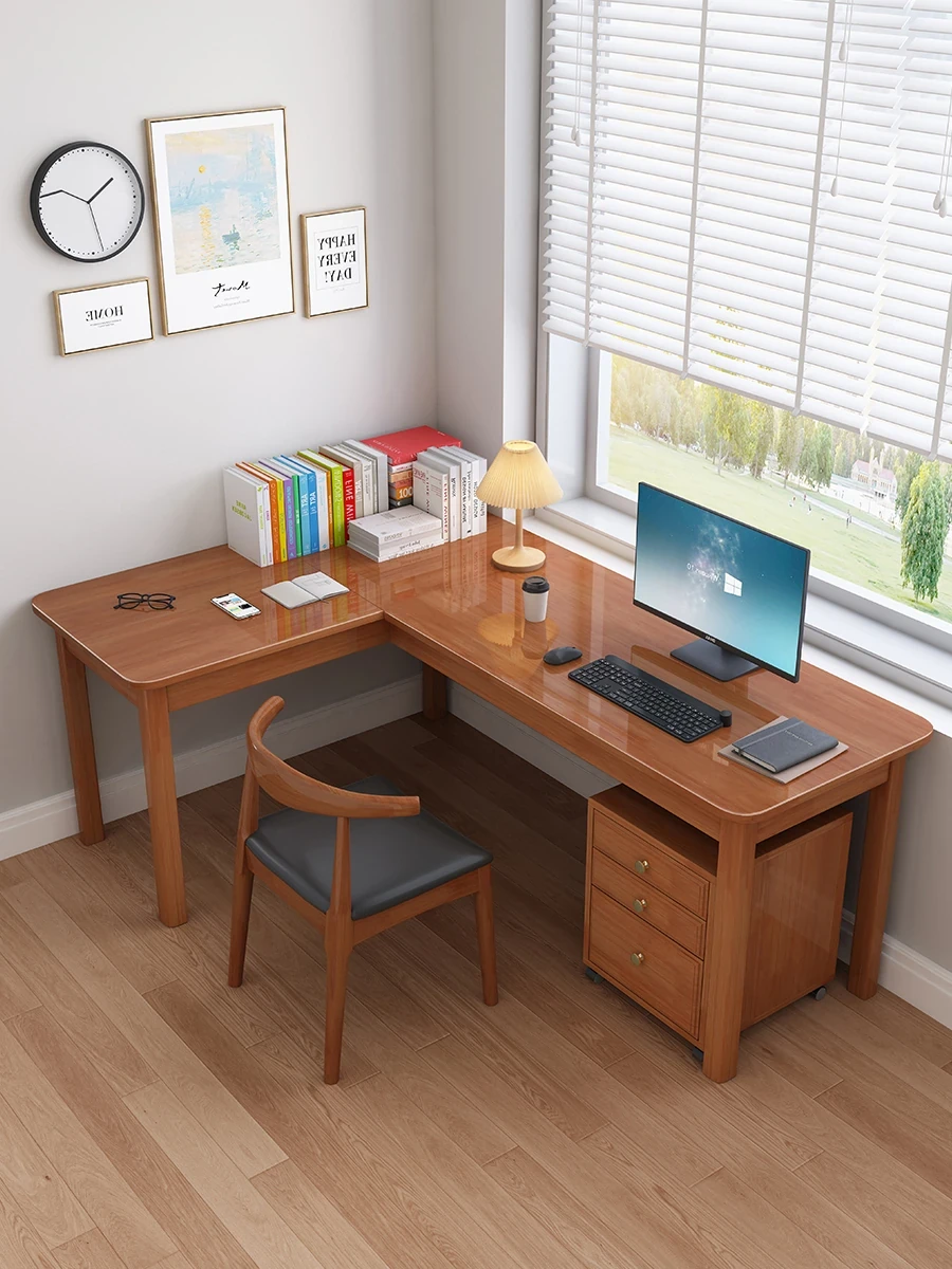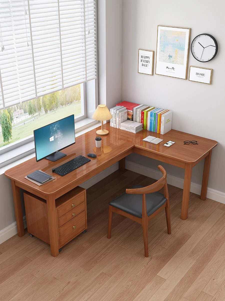 天然木材L型转角书桌 - 完美融入卧室的多功能工作空间,适合家居办公和飘窗电脑桌!