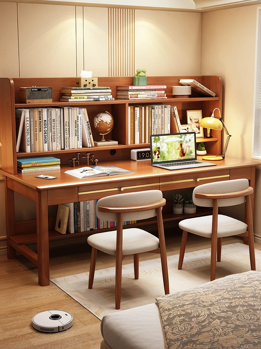 【魅力家具】高級天然木材2人用学習デスク&本棚付き!省スペースで実現するスタイリッシュな長机、快適な勉強&仕事環境へ!