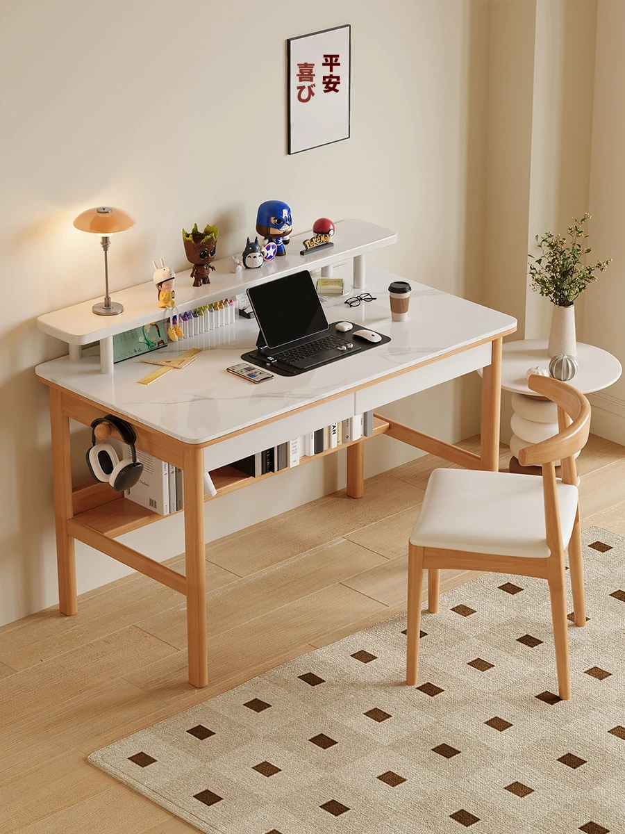 魅力満点!【岩板×天然木製】軽量ラグジュアリーデスク:引き出し付き本棚コンビ、クリーム風のシンプルデザインでご自宅やオフィスの両方に最適なワーク&学習スペースを実現!